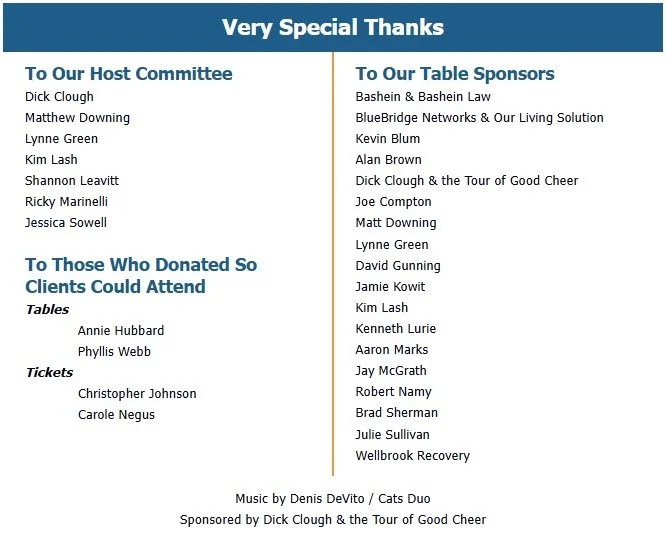 “This event wouldn’t have been possible without our incredible host committee and all of our table sponsors,” said event organizer Shaunna Jacobs. “Our goal of selling 20 tables was already ambitious—and they sold 22! Several tables were donated so our residential clients could attend.”